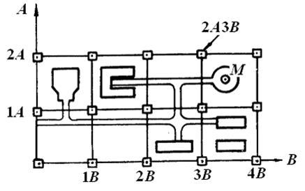 Строительная сетка на местности создается в виде системы квадратов или прямоугольников, ориентированных параллельно осям сооружений (рис. 2.4). В зависимости от характера строящихся объектов длина стороны квадратов или прямоугольников может составлять от 20 до 200 м. Для удобства пользования строительная сетка создается в условной системе координат. Начало системы координат выбирают так, чтобы все пункты имели положительные координаты, для этого начало координат совмещают с пунктом, расположенным в юго-западной вершине строительной сетки. Ось абсцисс обычно условно обозначают буквой А, а ось ординат – буквой В. В соответствии с этим линиям строительной сетки присваивают порядковую нумерацию (1 А, 2 А,..., 1 В, 2 В,...). Обозначения пунктов сетки содержат информацию об их координатах. Так, пункту 2 А 3 В соответствуют координаты А = 200 м и В = 300 м. По этому же правилу координаты точки М (А = 157,01 м; В = 345,96 м) записывают в виде 1 А + 57,01; 3 В + 45,96.
