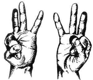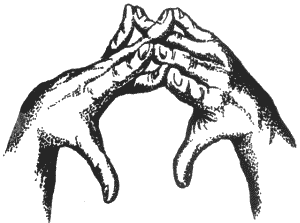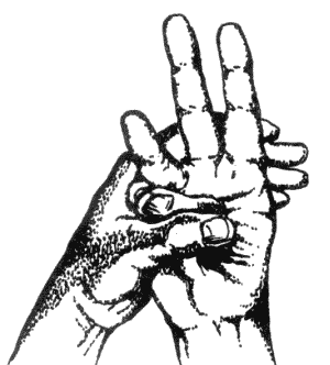Кешав Дэв занимается в своем ашраме в Индии исцелением больных, прибегая к различным естественным способам лечения, среди которых наряду с диетой большую роль играют мудры. «Первой реакцией моих пациентов, которым я говорю о мудрах, является скептицизм, – говорит целитель. – Как это мое здоровье может улучшиться, – удивляются они, – если я ничего не делаю, кроме легкого сжатия пальцев? Я объясняю им, что столь простые на первый взгляд методы – это чрезвычайно ценный дар, переданный нам посвященными мастерами йоги». По мнению Кешава Дэва, принцип балансирования энергии можно выразить следующим образом: если кончиком какого‑нибудь из пальцев коснуться подушечки большого пальца при одновременном нажатии большого пальца на этот палец, то элемент, соответствующий такому пальцу в организме, будет ослаблен. Желая усилить какой‑либо из элементов, следует прибегнуть к обратному порядку действий: большим пальцем коснуться подушечки соответствующего пальца. Есть одно исключение: безымянный палец (земля) и мизинец (вода) друг на друга не влияют, поэтому следует прибегать к другим вариантам. Упражнения следует выполнять без напряжения мышц и без усилий. Их можно делать во время прогулки, на скучном собрании, у телевизора или в путешествии. Упражнения выполняют обеими ладонями в общей сложности не менее 45 минут. Это время можно разделить на два или три коротких интервала. Результатов при некоторых заболеваниях следует ждать несколько недель, поэтому надо быть последовательным и терпеливым. Если же болезнь не запущена, заметного улучшения здоровья и самочувствия можно достигнуть уже через несколько дней, а иногда и в течение одного дня. Мы приведем для вас описание отдельных мудр. Шанкх Мудра (мудра раковины).