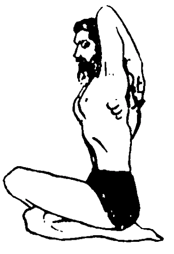 Сядьте на левую согнутую ногу таким образом, чтобы пятка находилась под анусом. Правая нога согнута таким образом, что пятка ее касается левой ягодицы. При этом следует заметить, что пальцы обеих ног должны касаться пола. Затем, когда уладили все с ногами, поднимите правую руку, согните ее в локте так, чтобы она опустилась за плечами между лопатками. Левую руку также следует согнуть в локте, но вниз и вывести ее вверх вдоль спины. Затем сцепите восемь пальцев обеих рук. Правый локоть должен быть опущен как можно ниже. Дыхание в асане обычное. Будьте в асане от 30 секунд до нескольких минут, концентрируясь на каком‑либо образе или органе тела. С практикой наращивайте постепенно время нахождения в ней. Асану следует выполнять на обе стороны. Выполнение Гомукхасаны дает возможность укрепить ступни, колени, талию, развить руки и плечи. Основная и уникальная характеристика этой асаны в том, что она значительно помогает при болезнях легких. Лица, страдающие астмой и туберкулезом легких, должны в первую очередь практиковать ее, так как движение воздуха в том легком, на чью сторону выполняется асана, почти прекращается, тогда как второе работает учащенно и сильнее. Меняя положение, мы заставляем «отдыхавшее» легкое войти в состояние повышенной активности. Таким образом включается и развивается очистительный эффект в легких, претерпевающих повышенную кровяную циркуляцию. В таком положении возможно вдыхать гораздо большее количество кислорода, чем это обычно необходимо. Это прекрасно вентилирует многочисленные легочные поры (пузырьки) и альвеолы. По этой «легочной» направленности асана может быть рекомендована всем без исключения людям.