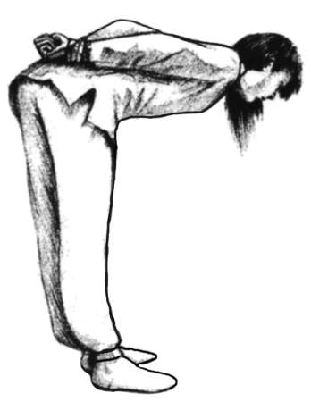 Это дыхательное (в первую очередь, дыхательное) упражнение выполняется следующим образом. Станьте прямо, пятки вместе, носки врозь. Левая рука захватывает правую за запястье за спиной. Правая рука при этом сжата в кулак, но кулак необычный: большой палец прижат к ладони, четыре пальца обхватывают его, образуя положение, которое называется «индиан дор». Только такое положение пальцев возможно для выполнения как данного упражнения, так и ряда последующих. Эта мудра играет определенную роль в правильном распределении энергии, «замыкая» ток праны и не давая ей рассеиваться. Эффект происходит как при крёстном знамении, когда большой палец «замыкает» ток, прижимаясь к кончикам мизинца и безымянного пальцев, с той лишь разницей, что при этом действии происходит отток энергии через противоположно заряженные указательный и средний пальцы. При мудре «индиан дор» никакого энергетического оттока не происходит, но, как уже упоминалось, имеет место процесс аккумуляции и удержания праны. Итак, после того, как вы стали, заведя руки за спину, наклоните туловище до параллельного с полом положения. Спина прямая, можно выгнуть позвоночник для большего ее выпрямления. Голова поднята вверх, шея сильно напряжена, глаза смотрят перед собой. Далее производим резкий поворот головы вправо, резко выдыхая через нос. Тут же возвращаем голову в исходное положение, вдыхая через нос. Затем то же самое влево, вниз и вверх. Сначала повторяйте всю серию 4‑5 раз. Со временем, если почувствуете потребность, увеличьте число повторений. Это упражнение способствует очищению верхних дыхательных путей, питает мозг кислородом, спасает от артрита. Также благотворно влияет на легкие.