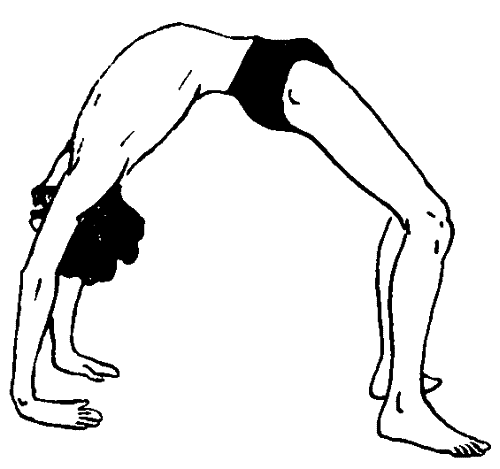 Лягте на спину, согнутые в коленях ноги подожмите пятками как можно ближе к ягодицам. Руки установите ладонями у головы. Затем на выдохе, опираясь на стоящие на полу ступни и руки, поднимите тело до возможных пределов. Постойте некоторое время в этом положении, затем опуститесь в исходную позицию, вдохните. Некоторое время отдохните, а затем повторите упражнение. Выполнять таким образом асану можно несколько раз. Утверждают, что эта асана в значительной мере задерживает старость. Самым непосредственным образом она влияет на позвоночник, из‑за чего он становится эластичным и подвижным. Талия обретает стройную форму, грудь расширяется. Преждевременное окостенение позвоночника является причиной наступления старости организма, таким образом, противодействуя затвердению, задерживается весь процесс старения.