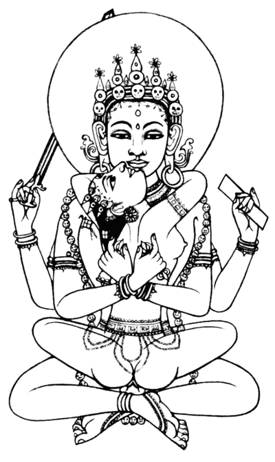 Идеализация сексуального союза в образе тантрических божеств. Руки мужского божества держат меч, символ мудрости, свиток, символ знания, колокольчик и ваджна означают слияние Йони и Лингама. С непальской миниатюры, XVIII в.