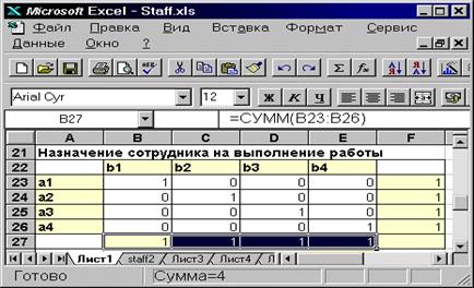 Из приведенной таблицы видно, что если сотрудник А1 назначен на выполнение работы В1, то остальные элементы строки и столбца должны быть равны =0 Из этого следует, что сумма переменных любой строки или столбца должна быть равна 1.