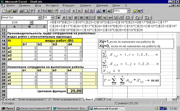 В результате выполненных действий, Excel предложит такое распределение сотрудников по видам работы, при котором производительность их труда будет максимальной (25 усл. Ед.)