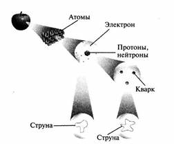 Вещество состоит из атомов, которые в свою очередь состоят из кварков и электронов. Согласно теории струн все такие частицы в действительности представляют собой крошечные петли вибрирующих струн. Если теория струн справедлива, микроскопическая структура нашей Вселенной представляет собой сложно переплетенный, многомерный лабиринт, в котором струны Вселенной бесконечно закручиваются и вибрируют, ритмично отбивая законы космоса. Свойства основных кирпичиков мироздания, — будучи совсем не случайными, — глубоко связаны со структурой пространства и времени».