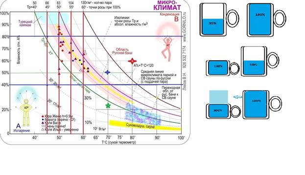 8. Влияние особенностей механизмов терморегуляции человека на субъективное восприятие процедуры парения. Как я уже говорил неоднократно, показания термометра или даже термометра и гигрометра вместе не могут дать нам всю полноту информации о том, что будет чувствовать человек, находясь в парной, и хоть психологические факторы играют огромную роль, но управление психологическим состоянием человека в парной большая, самостоятельная и отдельная тема. Здесь же мы рассмотрим факторы физические и физиологические. 8.1. Немного физики Сейчас вернёмся к тому графику, который я приводил в начале. Как видите, по горизонтальной оси на нём отложена температура, а по вертикальной относительная влажность. Напомню, что в заданном объёме воздуха при определённой температуре может раствориться только определённое количество пара, ну как в кружку больше не налить, а меньше можно. Вот относительная влажность и показывает, насколько процентов наполнена наша кружка.