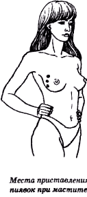 Признаки заболевания появляются спустя 1- 2 недели после родов. Поскольку появление травм сосков при болезни связано преимущественно с кормлением новорожденного, данная форма мастита получила названия лактационной. Известны случаи возникновения других, не лактационных, форм мастита: инфекция попадает в молочные железы из окружающей среды (через имеющиеся ссадины на коже) или из других очагов воспаления в организме, например, с кариозных зубов. Осложнениями воспалительного процесса в молочных железах бывают множественные абсцессы и флегмона всей пораженной железы. Прогноз, однако, при любой форме мастита (всего их известно 4) благоприятен. Лечение зависит от конкретной формы заболевания, обычно оно заключается в применении УВЧ, мази Вишневского, нередко и пенициллина. Вопрос о возможности кормления ребенка при мастите решает врач. При гнойном процессе грудное вскармливание противопоказано. Даже если прикладывать младенца к другой (непораженной) железе, его состояние иногда ухудшается. Профилактика мастита проста, ее правилам должны следовать все женщины, в особенности кормящие матери. Прежде всего необходимо следить за чистотой кожи и нижнего белья, бороться с имеющимися инфекциями, не применять травмирующие предметы во время эротических игр, своевременно обрабатывать повреждения бриллиантовым зеленым (после этой процедуры необходимо держать грудь открытой в течение 15 мин.). Важно заранее подготовить молочные железы к кормлению. Неподготовленная кожа сосков и ареол (околососковых кружков), будучи тонкой и нежной, легко повреждается, когда мать дает грудь ребенку. В первую очередь сказанное касается женщин, у которых соски плоские или втянутые. Следовательно, еще до рождения малыша будущая мама должна позаботиться о том, чтобы укрепить кожу сосков, правильно обрабатывая ее (необходимые советы можно получить в женской консультации, где будущую маму обучат правильному обмыванию груди перед кормлением и после него). Эффективность гирудотерапии при лечении разных форм мастита доказана неоднократно упоминавшимся ранее врачом В.В. Орловым в ходе проведения им клинических исследований в конце 40-х годов прошлого века. Он отметил общее хорошее состояние пациенток после постановки пиявок. У женщин снижалась температура, улучшались свойства кожи и подкожных тканей пораженной молочной железы. При лечении мастита пиявки берутся в количестве 2-4, а обычно 3 экземпляров, которые ставятся на больную молочную железу. К сожалению, не представляется возможным поставить пиявок непосредственно на сосок и ареолу, поскольку есть опасность еще более травмировать чувствительную кожу в этих местах. Область постановки пиявок при мастите представляет собой серпообразную линию, огибающую сосок и лежащую ближе к краю молочной железы.