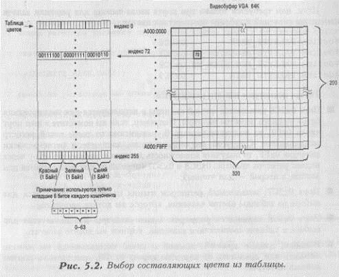 Позже в этой главе мы узнаем, как адресовать видеобуфер и записывать в него пиксели. Сейчас же я хочу поговорить о другом. Может возникнуть вопрос: «А не является ли экран 320х200 слишком маленьким?» Ответом будет: «И да, и нет». Сегодня разрешение 320х200 устарело, но благодаря 256 цветам и правильному рендерингу оно и по сию пору выглядит восхитительно. Эти плюсы заставляют нас забыть о низком разрешении. Кстати, игрок никогда не должен даже подозревать, что программа работает в режиме с низкой разрешающей способностью экрана. Конфигурация видеопамяти Давайте поговорим о записи в видеобуфер. Как вы можете видеть из рисунка 5.1, видеобуфер начинается с адреса А000:0000 и заканчивается по адресу AOOO:FF9F. Поскольку каждый пиксель представлен одним байтом, то адресация видеобуфера довольно проста. Все, что нам нужно сделать, это определить указатель на видеобуфер, после чего можно записывать пиксели, используя этот указатель. И все! Видеобуфер — это одна большая, непрерывная область памяти или массив байтов. Мы знаем, что он состоит из 320 байтов в каждой строке и таких строк насчитывается 200. Таким образом, чтобы нарисовать пиксель с координатами (х,у), нам надо: § Умножить координату Y на 320; § Прибавить Х-координату к результату умножения; § Использовать рассчитанное значение как смещение от базового указателя на видеобуфер; § По полученному адресу записать значение от 0 до 255. Таблицы цветов Как я уже говорил, мы можем записать по рассчитанному адресу число от 0 до 255. А что означает это число? Ответ прост - это цвет пикселя, который мы хотим отобразить. VGA-карта способна одновременно отобразить на экране до 256 цветов. Цвет, который мы хотим получить, должен быть представлен числом от 0 до 255. Это здорово, но какая связь между числом и действительным цветом? Число используется как индекс в таблице цветов, хранящей действительные значения цвета, который мы увидим на экране. Всего же VGA-карта способна отобразить 262144 цвета. Таким образом, если нам надо записать в видеобуфер значение цвета, то нам понадобится три байта для представления числа такой длины. Впрочем, и видеобуфер в этом случае будет просто огромен. Поэтому, создатели карты предусмотрели возможность переадресации графического адаптера. Переадресация означает, что одна числовая величина используется в качестве адреса другого значения (примерно, как именованный указатель в Си). Вместо одновременного воспроизведения всех 262144 цветов, разработчики VGA-карт дали возможность использовать подмножество из 256 цветов. В результате VGA-карта имеет таблицу отображения цветов, включающую 256 значений. Каждое из этих значений состоит из 256 элементов размером в один байт, содержащих значения красного, синего и зеленого для выбранного цвета (помните, красный, зеленый и синий в комбинации могут образовывать любой цвет.) Таблица цветов состоит из 768 байт (3х256). Например, когда карта считывает из видеобуфера число 72, то она проверяет адрес 72 в таблице цветов. Адрес 72 находится по смещению 72х3 от начала таблицы, поскольку каждое из значений занимает три байта. Затем значения зеленого, красного и синего считываются из таблицы и используются как значения сигналов. Давайте рассмотрим рисунок 5.2 для более подробного ознакомления.