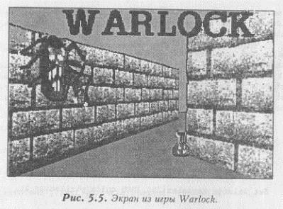 Примечание Отсканированные фотографии, как правило, содержат большое количество цветов, более ли менее равномерно распределенных по всему изображению. Таким образом, фотографические изображения с трудом поддаются сжатию. Однако, поскольку большинство картинок в компьютерных играх выполняется вручную, мы можем не особенно ломать голову над проблемами, возникающими при работе с оцифрованными фотографиями. Давайте посмотрим на рисунок 5.5 (файл CH19\WARINTR2.PCX на дискете). Это копия экрана из игры Warlock. Как вы можете заметить, там не слишком много цветов. Более того, на нем присутствует множество больших, одинаково окрашенных областей. Как правило, в экранных изображениях используется лишь ограниченное число цветов. Так почему бы не подсчитать количество пикселей одинакового цвета и не сохранить их как целые группы, вместе с позицией и цветом. Это можно сделать. В общем, подобная технология, правда, в несколько усовершенствованном виде, и применена в PCX-формате. Для сжатия информации этот формат использует так называемое RLE-кодирование. При этом изображение обрабатывается построчно без учета расположения пикселей по вертикали. Посмотрите на рисунок 5.6. Преобразование экранного файла в PCX-формат происходит следующим образом; просматривается очередная строка изображения, и если это возможно, сжимается. Сжатие выполняется в том случае, если найдена последовательность пикселей одинакового цвета. При этом сохраняется