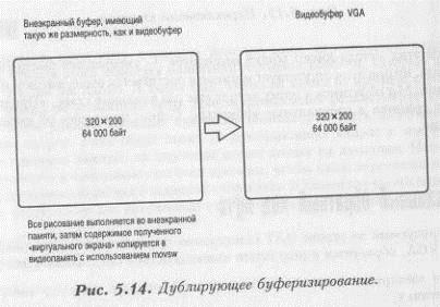 Теперь и печать текстов не представляет труда. Нужно только выдерживать пространство между символами и печатать их из заданной строки один за другим, пока не встретится конец строки (NULL). В демонстрационной программе в конце этой главы мы используем подобную функцию. Теперь давайте поговорим о методах анимации и рендеринга, которые применяются технике программирования игр. Дублирующее буферизирование Дублирующее буферизирование — это метод, позволяющий избежать мерцания, которое может возникать при перемещении объектов. Когда функции, которые мы пишем, рисуют спрайты па экране, то они это делают, не учитывая статус состояния VGA-карты, то есть в них отсутствует синхронизация с дисплеем. Существует два способа уменьшить возможное мигание. Первый метод называется дублирующим буферизированием. При этом экранное изображение формируется в памяти, а затем копируется в видеобуфер. Это позволяет минимизировать перемещение маленьких участков в видеопамяти, поскольку сразу перемещается один блок. Пример дублирующего буферизирования изображен на рисунке 5.14. Переключение страниц - это видоизмененное дублирующее буферизирование. При использовании этого метода две видеостраницы находятся во взаимосвязи. Когда одна из них воспроизводится на экране, другая перерисовывается. Новая страница затем воспроизводится переключением указателя на нее. Обратите внимание на рисунок 5.15 для осмысления этого метода. Оба этих метода имеют общий недостаток - уменьшение быстродействия в два раза, но при этом отсутствует мигание и достигается очень высокое качество анимации. Мы обратимся к этому методу еще раз в седьмой главе, «Продвинутая битовая графика и специальные эффекты». Сейчас поговорим об уменьшении мерцания.