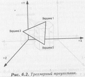 Используя структуры из Листинга 6,1, давайте определим линию, которая начинается в точке (0,0,0) и идет в точку (100,200,300) line linel; linel.start.x = 0; linel.start.у= 0; linel.start.z = 0; linel.end.x = 100; linel.end.у = 200; linel.end.z = 300; Теперь мы имеем описание линии. Если мы захотим, то сможем создать трехмерный мир, состоящий из линий и точек, но это будет скучным и тоскливым занятием. Нам нужен больший уровень абстракции для моделирования объектов, и для этого нам пригодятся многоугольники. Как вы поняли из четвертой главы, многоугольник - это множество вершин, соединенных отрезками прямых. Вершины определяют границы многоугольника. В трехмерном пространстве Многоугольники очень похожи на своих двухмерных собратьев. Попробуем определить трехмерный треугольник. Он может выглядеть так, как это изображено иа рисунке 6.2.