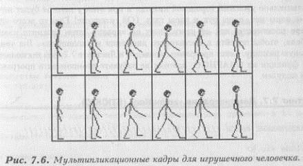 Ошибка» возникающая при расчете таким методом, пренебрежительно мала, и если уменьшение или увеличение компонентов RGB будет производиться всего несколько раз, изменение тона исходного цвета будет практически незаметным. Связь мультипликации с контекстом Как это ни удивительно, но на связь мультипликации с контекстом крайне редко обращают внимание в компьютерных играх. Контекст означает «связь с окружением или основой». В играх контекстом являются разнообразные дейст вия по ходу игры. Что бы ни делал персонаж в игре: умирал, прыгал, стрелял или еще что-нибудь, -- все это часть контекста игры. Мультипликация и различные эффекты, которые связаны с контекстом, придают игре дополнительную реалистичность и размах. Попробую пояснить на примере, что я имею в виду. Представьте, что мы имеем игру, в которой герой может гулять, прыгать, бегать и стрелять. Независимо от того, перепрыгивает ли он через паука или озеро, во время прыжка мультипликация обычно бывает всегда одна и та же. Но что если для каждого случая, или соответствующего контекста мы сделаем отдельный мультик? Например, когда герой перепрыгивает просто через лужу, то он не совершает ничего кроме собственно прыжка. А вот когда ему приходится перепрыгивать через паука, то он может, например, издать пронзительный крик ужаса и показать изумительную сноровку в прыжках. (И действительно, приземление на большого склизкого паука, возможно, не самый лучший опыт для маленького героя, которого заманили в виртуальный компьютерный мир.) Итак, контекстнозависимая мультипликация, используя набор соответствующих вариантов движений, учитывает тем самым окружение и внешние обстоятельства в каждый момент игрового действия, что дополнительно разнообразит зрительное восприятие игры. «Animotion» Animation (animation ( мультипликация )+ motion (движение)) — это придуманное мною слово, которое должно войти в словарь терминов компьютерных игр. (Дальше я тоже буду выдумывать слова, но они уже не будут так хороши как это.) Оно описывает точное слияние анимации (мультипликации) и движения. В игре Tombstone четвертой главы, "Механизмы двухмерной графики", маленький ковбой гуляет по улице. В действительности это больше похоже на то, что он одновременно ковыляет и совершает дикие прыжки (если такое вообще можно представить). Вся проблема заключается в принципе его движения, которое не было синхронизировано с мультипликационными кадрами. Многие объекты, в компьютерных играх имеют постоянную скорость. Такие игровые объекты как ракета и прочие летающие предметы — хороший тому пример, Однако к имеющим под собой опору (например, землю) объектам, которые должны выглядеть реально, нужно применять совсем другой подход. «Animotion» абсолютно необходим, если вы хотите, чтобы движение -ходьба, бег или прыжки — выглядели реалистично. Иначе мультипликационные объекты выглядят неестественно. Мы не можем просто в цикле менять мульти пликационный кадр и одновременно передвигать объект на произвольное расстояние. Мы должны рассмотреть каждый кадр и определить, на сколько в действительности следует перемещать объект для этого кадра. Затем мы создаем таблицу выбора для движения, в которой в качестве индекса используем номера кадров. В этой таблице будут содержаться величины перемещений, которые и будут использоваться при оживлении карти