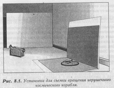 примера к этой главе, я заснял на видеокамеру вращение игрушечного космического корабля, а затем оцифровал полученные кадры. Для этого я закрепил камеру и объект на определенном расстоянии друг от друга, как показано на рисунке 8.1, и для каждого снимка чуть-чуть поворачивал игрушку вокруг вертикальной оси. Таким образом, я получил 12 кадров, которые изображали корабль под разными углами. Эти кадры приведены на рисунке 8.2. Если мы последовательно отобразим их на экране, то получим иллюзию вращающегося в сотне шагов от нас космического корабля.