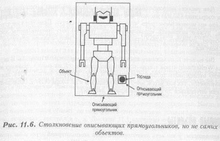 Существуют более эффективные методы контроля столкновений прямоугольников, но основная идея, я думаю, понятна. Использовать этот метод не так уж и плохо. Однако может возникнуть такая ситуация, когда мы решим, что произошло столкновение объектов, а на самом деле пересеклись только описанные прямоугольники, а не истинные изображения. Рисунок 11.6 поясняет такую ситуацию.