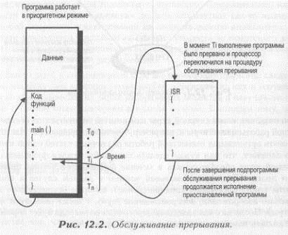 При создании компьютерной игры нам незачем заботиться об обеспечении совместной работы нашей игры и, например, текстового процессора. Нас должна Интересовать организация совместной работы различных частей одной программы. Это означает, что нам нужно сделать так, чтобы каждая функциональная часть нашей игры обрабатывалась в течение некоторого времени, причем не слишком долго. (Под функциональной частью в данном случае я понимаю Фрагменты текста программы (подпрограммы), которые осуществляют вывод графического изображения, воспроизведение звука, а также реализуют логику самой игры). После того как каждая подпрограмма по очереди будет обработана, процесс должен повторится с начала, образуя игровой цикл. Мы можем считать, что отдельная программа на Си, представляющая собой процедуру, вызывающую функциональные части, является своего рода маленьким виртуальным компьютером. При этом каждая из упомянутых функций это не что иное, как отдельная задача, выполняемая в псевдомногозадачном режиме. Отметим, что программа всегда контролирует выполнение функциональных частей, и игра может быть написана таким образом, что исполнение программы и функциональных частей никогда не прерывается другими процессами: На самом деле это очень удобно: сложные компьютерные игры могут быть написаны и пишутся в виде единой программы безо всяких прерываний. Однако прерывания позволяют реализовать хоть и примитивную, но истинную многозадачность следующим образом; § Выполнение программы может прерываться в любой произвольной точке. Состояние машины сохраняется таким образом, чтобы впоследствии можно было возобновить работу программы; § После этого управление персональным компьютером передается обработчику прерывания, который представляет собой отдельную законченную программу; § После завершения работы обработчика прерывания или процедуры обслуживания прерывания (ISR) возобновляется выполнение программы с того момента, с которого она была прервана. На рисунке 12.2 показано, как происходит обслуживание прерывания.