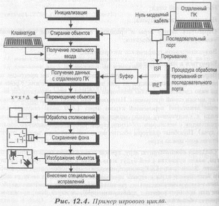 Как вы можете видеть, цикл игры включает в себя все обсуждавшиеся ранее компоненты: § Инициализацию объектов игры; § Удаление объектов; § Ввод данных локальным игроком; § Ввод данных удаленным игроком; § Выполнение преобразований; § Расчет столкновений; § Вызов подпрограммы, перемещающей снаряды; § Воспроизведение графического изображения в автономном буфере экрана. В нужный момент это изображение мгновенно возникнет на экране. Это хороший пример цикла игры. Он включает в себя все компоненты, присущие более сложным играм. Однако сама игра проста в исполнении и я вполне мог бы обойтись без использования прерываний и синхронизации. (Хотя на самом деле это не так - передачу данных через последовательный порт в любом случае пришлось бы осуществлять при помощи обработчика прерывания, но об этом вы узнаете в четырнадцатой главе). Как бы то ни было, у меня не происходило никаких асинхронных событий, я не создавал сложную систему. воспроизведения звука и был избавлен от необходимости выполнять критичную по времени обработку данных, которая наверняка потребовала бы строгого слежения за временем исполнения посредством использования прерываний. Теперь давайте поговорим о методах создания программного обеспечения, помогающих избежать некоторых характерных для компьютерных игр проблем. Конечно, можно обойтись и без этих хитростей и уловок, но с ними будет проще быстро написать хорошую игру. Автономные функции В компьютерной игре каждую секунду происходят сотни (если не тысячи) самых разнообразных вещей и программа должна следить за множеством различных переменных и состояний. Однако большинство действий, которые происходят во время игры, не нуждаются в жестком контроле со стороны основной программы, поэтому было бы неплохо сделать некоторые функции «самодостаочными» с точки зрения инициализации, синхронизации и тому подобных действий. Я назвал такие функции автономными. Я придумал для них такое название с тем, чтобы подчеркнуть присущую им способность совершать операции, не требуя внимания со стороны программы. Программа в течение цикла игры должна только вызывать эти функции в нужный момент, а все остальное они выполнят сами. Допустим, например, что мы хотим сделать функцию, которая медленно изменяет содержимое регистра определенного цвета. Этот регистр может использоваться для изображения различных мелких деталей на экране. При выполнении функции изменяется цвет регистра, и таким образом изменяется один из цветов экрана. Результат работы этой функции отражается только на изображении. Функция, решающая подобную задачу идеально приспособлена для автономной работы. В Листинге 12.3 приведен текст программы, реализующей такую функцию. Date: 2015-09-18; view: 505; Нарушение авторских прав |