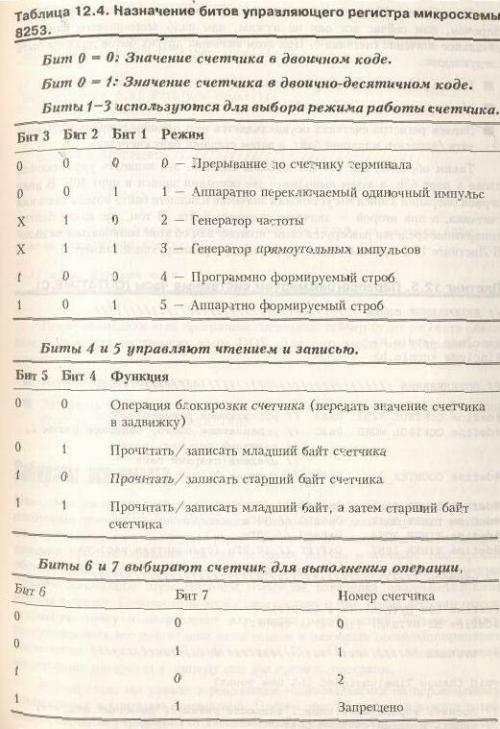 Таким образом, нам следует перепрограммировать счетчик 0 таким образом, чтобы он генерировал прерывания с более подходящей для нашей игры частотой - так, чтобы наша игра могла контролировать события чаще чем 18.2 раза в секунду. Давайте посмотрим, каким образом можно задать соответствующее значение счетчика. Нас интересуют порты ввода/вывода 40h и 43h (все, о чем мы будем говорить, относится к ним): счетчик 0 и соответствующий управляющий регистр. Значения битов управляющего регистра, показаны в таблице 12.4.