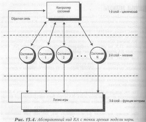 // ВКЛЮЧАЕМЫЕ ФАЙЛЫ //////////////////////////////////////// #include <stdio.h> #include <graph.h> #include <math.h> // ГЛОБАЛЬНЫЕ ПЕРЕМЕННЫЕ //////////////////////////////////////// // Указатель на системную переменную, содержащую // значение таймера. Содержимое этой 32-битовой ячейки // обновляется 18.2 раза в секунду unsigned int far *clock=(unsigned int far *)0x0000046C; ////////////////////////////////////////// void Timer(int clicks) { // эта функция использует значение таймера для формирования // задержки. Необходимое время задержки задается в "тиках" // интервалах в 1/18.2 сек. Переменная, содержащая 32-битовое // текущее значение системного таймера расположена // по адресу 0000:046Ch unsigned int now; // получить текущее время now = *clock; // Ничего не делать до тех пор пока значение таймера не // увеличится на требуемое количество "тиков". // Примечание: один "тик" соответствует примерно 55 мсек. while(abs(*clock - now) < clicks){} } // конец функции Timer // ОСНОВНАЯ ФУНКЦИЯ ///////////////////////////////////// void main(void) { int ex=160,ey=100; // начальная позиция "Мухи" int curr_xv=1,curr_yv=0, // текущие факторы // преобразования Координат. clicks=0; // время, через которое // "Муха" прекращает движение //в произвольном направлении. _setvideomode(_MRES256COLOR); printf(" The Dumb Fly - Any Key to Quit"); //главный игровой цикл while(!kbhit()) { // очищаем точки на экране _setcolor(0); _setpixel(ex,ey); // перемещение "Мухи" // "мозговой штурм" // закончить ли движение в текущем направлении? if (++clicks—20) { curr_xv = -5 + rand()%10; // от -5 до +5 curr_yv = -5 + rand()%10; // от -5 до +5 clicks=0; } // конец задания нового направления // перемещаем "Муху" ex+=curr_xv; ey+=curr_yv; // убеждаемся, что "Муха" находится в пределах экрана if (ex>319) ex=0; if (ех<0) ех=319; if (ey>199) ey=0; if (еу<0) еу=199; // конец "мозгового штурма" // рисуем "Муху" _setcolor(12); _setpixel(ех,еу); // небольшая задержка... Timer(1); } // конец цикла while _setvideomode(_DEFAULTMODE); } // конец функции main Думаю, после запуска программы вы согласитесь с тем, что мы, наконец получили все необходимое для моделирования летающего «разумного существа». Несколько простых правил, шаблоны и случайные числа помогли нам создать довольно правдоподобную имитацию полета насекомого. Это просто чудесно! Теперь настало время поговорить о конечных автоматах. Конечные автоматы Конечные автоматы (КА) - близкие друзья самых разнообразных механизмов. пни царствуют в виртуальном пространстве компьютеров. КА используются в разработке аппаратного и программного обеспечения. Поскольку мы коснулись этой темы, скажу, что КА - это программно моделируемая машина, которая движется от состояния к состоянию, основываясь на входных данных. Кроме того КА обычно запоминает все состояния, в которых он побывал. Посмотрите на рисунок 13.3, на котором изображена диаграмма простейшего КА. (Что именно этот КА делает - не имеет никакого значения). Как видите, КА имеет набор состояний, представленных кружками и объединенных дугами переходов от состояния к состоянию. Эти дуги показывают правила, по которым происходят переходы из одного состояния в другое. КА могут быть использованы в видеоиграх как один из методов высокоуровневого управления логикой, с помощью которого передаются команды «низ коуровневой» логике. Так же, как наш мозг имеет кору, передающую наши желания в более низкоуровневые моторные доли мозга, КА может быть использован для инициации, управления и перехвата низкоуровневых действий, выполняемых имитатором мозга. Как пример мы могли бы использовать все, что нам уже известно о преследовании, уклонении, шаблонах и случайных передвижениях для констру ирования КА, способн
