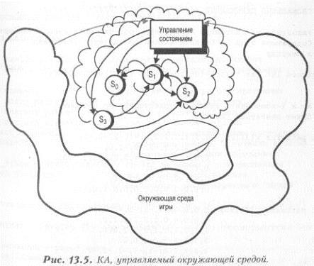 Теперь у нас есть набор решений, чтобы ответить на вопросы: § Какая причина заставит КА изменить свое состояние? § Как заставить КА выбрать следующее состояние? Это хорошие вопросы - посмотрим, как выглядят видеоигры изнутри. Взгляните на рисунок 13.4. На нем показано абстрактное представление некоторого КА, правда, пока еще без логики смены состояний. Конечный автомат, управляемый окружающей средой Теперь наступает приятная часть. Мы можем создать КА, в котором состояний перехода представлены рядом переменных. Другими словами, мы управляем конечным автоматом с помощью самой игровой среды, в которой он находится, так же, как наш собственный мозг реагирует на окружающую обстановку. Начнем создавать КА с того, что он будет случайным образом выбирать одно из нижеперечисленных состояний: § преследование; § уклонение; § случайное; § шаблон. Но в настоящей игре для управления состоянием КА вместо случайных чисел было бы лучше привлечь саму игровую ситуацию. Ниже приведен пример КА действующего по обстоятельствам: § Если игрок близко, КА переключается в состояние Шаблон; § Если игрок далеко, можно заставить ПК охотиться за ним, используя состояние Преследование; § Если игрок обрушил на наше маленькое создание шквальный огонь, КА моментально переходит в состояние Уклонение; § Наконец, при любой иной ситуации КА отрабатывает состояние Случайное. Рисунок 13.5 демонстрирует подобное поведение конечного автомата.