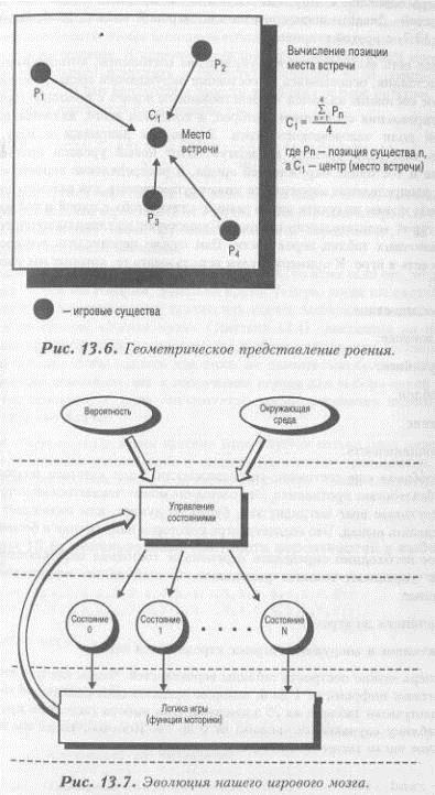 (А) Атака 5% (П)Преследование 60% (С)Случайное 20% (Р)Роение 10% (Ш)Шаблон 5% Как вы можете судить по распределению вероятностей, Аннигилятор преимущественно атакует, Хныкалка предпочитает преследование, а Умник -что-то среднее между ними. Прежде чем перейти к разговору о реализации вероятностей, я хочу поговорить еще об одном принципе поведения игровых объектов — о роении. Роение означает, что создания в игре сбиваются в кучи и пытаются как-то сгруппироваться. Это похоже на то, как настоящие солдаты или насекомые иногда стремятся собраться вместе и остаться рядом друг с другом. В действительности, это не что иное, как выбор общей точки встречи и целеустремленное движение к ней. Мы можем использовать такой тип поведения как совершенно новое состояние, при котором создания кажутся группирующимися. Моделирование этого состояния не очень сложно: § Выбрать существа, которые вы хотите сгруппировать вместе; § Выбрать среднюю относительно всех созданий позицию. Эта точка в пространстве является центром и может быть использована для вычисления траекторий движения всех объектов, которые следуют к ней; § Вычислить траекторию так, чтобы каждое создание следовало к центру. В состояние роения имеет смысл переходить, когда слишком много противников вдруг начинают одновременно изрыгать огонь, торпеды и прочие средства уничтожения. Наверное, логичнее всего объединять существ по типам. Посмотрим на рисунок 13.6, на котором показано геометрическое представление роения.