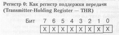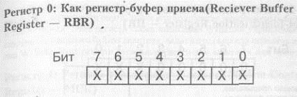 Регистр 0 также выполняет функции буферного регистра приема. В зависимости от того, пишете вы в него или читаете из этого регистра, буфер передает или принимает символы с другого компьютера соответственно. В любом случае, при чтении из этого регистра он содержит последний переданный ему символ.