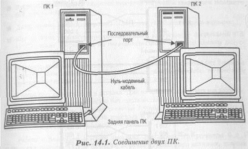 2 Передача данных TXD 3 Прием данных RXD 4 Запрос на пересылку RTS 5 Сигнал очистки для пересылки CTS 6 Сигнал готовности набора данных DSR 7 Земля GND 8 Сигнал наличия несущей CD 20 Сигнал готовности ввода данных DTR 22 Индикатор звонка RI Операции с ROM BIOS Прежде чем мы начнем писать собственную коммуникационную программу, давайте посмотрим, чем нам может помочь ROM BIOS? Она поддерживает коммуникации через последовательный порт, хотя и весьма ограниченно. Эти функции доступны через прерывание 14h. Существуют функции для открытия последовательного порта, его конфигурирования, чтения и записи символа. Однако существует одна маленькая проблема: эти функции не работают (трудно в это поверить, но они действительно не работают). На самом деле они работают, правда, при особых условиях, которые нам вряд ли удастся создать. К сожалению, отсутствует крайне необходимая нам поддержка ввода/вывода, управляемого прерыванием. В видеоиграх мы должны иметь систему управления событиями, основанную на прерываниях. Из-за этого, а также из-за того, что функции ROM BIOS работают очень медленно, мы можем вообще не рассматривать их как реальное средство передачи битов по проводам. Теперь, когда я вам сказал об этом, давайте посмотрим, каким Образом все-таки можно соединить два компьютера и создать маленькую сетевую игру. Соединение через нуль-модем Как я уже сказал в самом начале, у нас не хватит времени вникать во все тонкости использования модема. Существует слишком много тем, которых мы слегка коснулись, и все они имеет отношение к дизайну видеоигр. Что я намерен сделать вместо этого, так это создать коммуникационную систему, использующую соединение типа нуль-модем, в котором модем, как таковой, отсутствует. Нуль-модем — простое соединение, которое связывает два компьютера через последовательные порты. Рисунок 14,1 демонстрирует такое соединение.