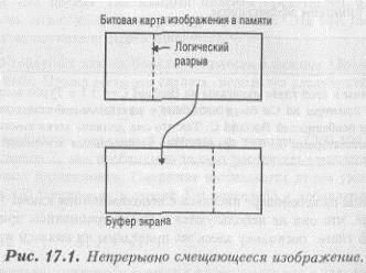 Так каким же образом этот способ вывода изображения приводит к появлению эффекта смещения? Для понимания происходящего посмотрим, что случится, когда вы уменьшаете значение LeftHalf на единицу. Декрементируя LeftHalf, вы уменьшаете на единицу ширину левой половины. В результате последний пиксель левой половины становится первым пикселем правой. Такое логическое перемещение данных изображения из одной половины в другую как раз и создает эффект прокрутки. Затем обе части изображения выводятся на экран. Делается это так. Начиная с левой границы экрана, рисуется правая логическая часть изобраяжения: § Сначала выводится строка пикселей изображения, начиная со столбца определенного переменной LeftHalf. Количество рисуемых писелей равно общей ширине изображения минус LeftHalf; § Продолжайте рисование пикселей от левого края изображения до столбца LeftHalf. Если положение логического разрыва изменить и перерисовать изображение заново, оно будет выглядеть движущимся по экрану. Взгляните на следующий пример, демонстрирующий рисование двух половинок строки развертки изображения (вспомните, что разверткой называется полная горизонтальная строка пикселей). // нарисовать левую половину изображения memcpy(Screen+320-LeftHalf, Bitmap, LeftHalf); // нарисовать „правую часть изображения memcpy(Screen,Bitmap+LeftHalf,320-LeftHalf); где Screen - указатель на видеопамять, LeftHalf - ширина логической левой части изображения, a Bitmap - указатель на битовую карту изображения, загруженную в память. Этот процесс повторяется для каждой строки развертки изображения. Каждый раз, когда вы увеличиваете значение LeftHalf на единицу, вы должны убедиться, что оно не превышает общей ширины изображения: § Если LeftHalf больше ширины изображения, присвойте ей значение, равное единице; § Если LeftHalf меньше единицы, присвойте ей значение, равное общей ширине изображения. Запомните это, поскольку вы должны рисовать и левую и правую половину, причем ширина каждой логической части должна быть меньше общей ширины изображения. Листинг 17.1 - это файл заголовка PARAL.H, в котором содержатся объявления различных констант, структур данных, а также прототипы функций, используемых в демонстрационной программе из Листинга 17.2 (PARAL.C). Date: 2015-09-18; view: 582; Нарушение авторских прав |