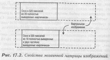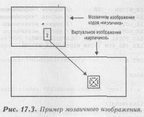 Это свойство несколько упрощает построение мозаичного изображения. Таким образом, этот процесс состоит из трех шагов: 1. Рисование первого (возможно, не полностью выведенного) «кирпичика»; 2. Рисование нескольких (полностью выведенных) «кирпичиков»; 3. Рисование последнего (возможно, не полностью выведенного) «кирпичика». Также нам необходимо иметь в программе целочисленный счетчик, который будет указывать местоположение видимого экрана внутри виртуального изображения. Программа из Листинга 17.6 (TILES.С) демонстрирует моделирование мозаичных слоев. Самые ближние слои состоят из нескольких «кирпичиков». Определение виртуального изображения сохранено в файле TILEMAP.DAT, который представляет собой обычный ASCII-файл и обрабатывается во время инициализации. Цифры в файле представляют собой закодированные имена PCX-файлов. Обратите внимание, что код 0 зарезервирован для «прозрачного кирпичика». Рисунок 17.3 показывает небольшой пример мозаичного изображения. Важным отличием между этой программой и демонстрационной программой двойного параллакса в Листинге 17.3 является добавление функции DrawTile().