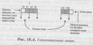 Завершим анализ изображения этой линии тем, что каждая конечная точка в действительности занимает один байт, а не два. Следовательно, мы должны написать программу, которая может управлять состоянием, когда конечные точки BYTE или WORD граничат. Программа из Листинга 18.6 делает это.