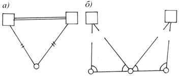 Укажем на важную особенность координатных определений с помощью спутниковой аппаратуры. Пусть определяемые точки 3, 4 находятся на расстоянии 100 м одна от другой и на удалении ≈ 10 км от опорных пунктов 1, 2 (рис. 24, б). Угол засечки g примем равным 45°. Пренебрегая ошибками центрирования, вычислим среднюю квадратическую ошибку положения определяемых точек по формуле