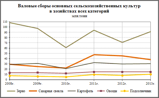 В 2013г. снизился валовой сбор сахарной свеклы (на 16,2%), что обусловлено сокращением убранных площадей (на 20,7%). Валовой сбор семян подсолнечника увеличился (на 27,7%), в основном, за счет роста урожайности (на 20,0%). Сбор картофеля и овощей также выше уровня предыдущего года (соответственно на 2,2% и 0,3%), что обусловлено увеличением урожайности. Производство льноволокна сократилось (на 17,3%) за счет снижения убранных площадей (на 8,7%) и урожайности (на 9,8%).