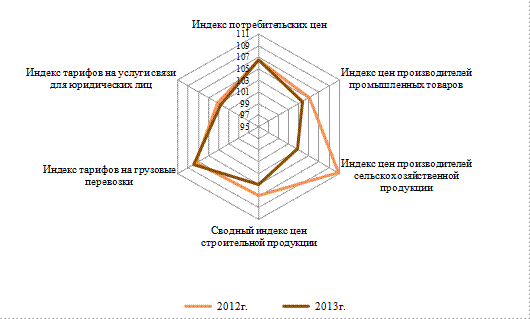 | Индексы цен и тарифов в декабре 2012 и 2013 годов на конец периода, в % к декабрю предыдущего года