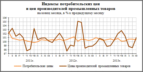 В декабре 2013г. по сравнению с предыдущим месяцем индекс потребительских цен составил 100,5%, в том числе на продовольственные товары - 100,8%, непродовольственные товары - 100,2%, услуги - 100,6%.