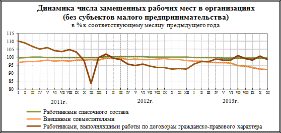 В ноябре 2013г. в общей численности занятого в экономике населения 33,9 млн.человек, или 47,6% составляли штатные работники (без учета совместителей) организаций, не относящихся к субъектам малого предпринимательства. На условиях совместительства и по договорам гражданско-правового характера для работы в этих организациях привлекалось еще 1,7 млн.человек (в эквиваленте полной занятости). Число замещенных рабочих мест работниками списочного состава, совместителями и лицами, выполнявшими работы по договорам гражданско-правового характера, в организациях (без субъектов малого предпринимательства) в ноябре 2013г. составило 35,6 млн.человек и было меньше, чем в ноябре 2012г. на 309 тыс.человек, или на 0,9%. Таблица 3 Динамика числа замещенных рабочих мест в организациях