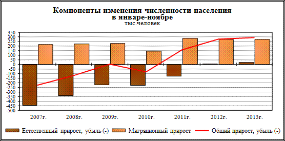 В январе-ноябре 2013г. в России отмечалось уменьшение числа родившихся (в 52 субъектах Российской Федерации) и числа умерших (в 69 субъектах). В целом по стране в январе-ноябре 2013г. число родившихся превысило число умерших на 22650 человек. При этом в 40 субъектах Российской Федерации наблюдается превышение числа умерших над числом родившихся, из них в 13 субъектах Российской Федерации это превышение составляло 1,5-1,8 раза.