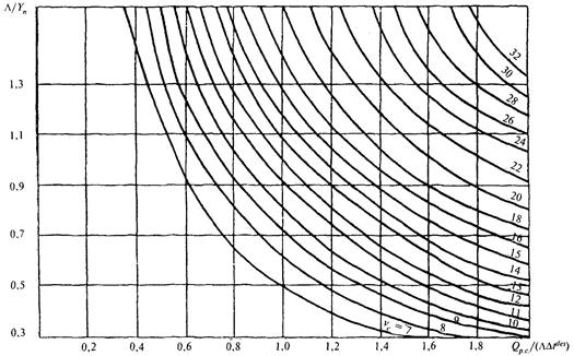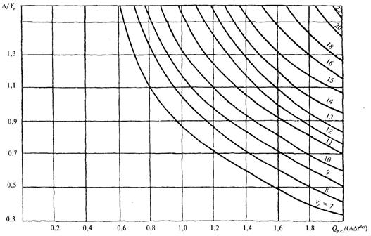 для i -го слоя (i = n -2, n -3,..., 1) — по формуле (59); г) для внутренних ограждающих конструкций величина Yint определяется как для наружных ограждений, но принимается, что в середине ограждений s = 0. Для несимметричных ограждений их середину следует назначать по половине величины S D всего ограждения; д) при наличии в ограждающей конструкции воздушной прослойки коэффициент теплоусвоения воздуха s в ней принимается равным нулю. В формулах (57) — (60) и неравенствах: D 1, D 2,..., Dn — тепловая инерция соответственно 1-го, 2-го,..., n -го слоев конструкции, определяемая по формуле (53); Ri,.., Rn -1, Rn — термические сопротивления, м2·°С/Вт, соответственно i -го,..., (n -1)-го и n -го слоев конструкции, определяемые по формуле (8); s 1,..., si,..., sn -1, sn — расчетные коэффициенты теплоусвоения материала 1-го,..., i -го,..., (n -1)-го и n -го слоев конструкции, Вт/(м2·°С), принимаемые по приложению Д; Yi +l — коэффициент теплоусвоения внутренней поверхности (i +1)-го слоя конструкции, Вт/(м2·°С); a ехt — то же, что и в формуле (8). 11.2.2.4 Полученная по формуле (54) расчетная амплитуда колебаний результирующей температуры помещения 11.2.2.5 Выбор типа теплоаккумулирующего прибора по показателю затухания тепловой волны в нем vc производится по графикам рисунков 2—4 для различных режимов его зарядки в зависимости от сочетания L/ Yn и Qp.c /(LD tdes), обеспечивая в левом секторе от кривых условие