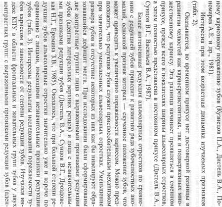 Эволюционное развитие жевательного аппарата, пройдя борьбу противоречий дифференциации и редукции, достигло наибольшего совершенства у приматов. Если на длительном этапе развития позвоночных от хрящевых рыб до гоминид как бы на первый план выступает дифференциация жевательного аппарата, то в истории развития гоминид, а также в истории самого человека на первый план выступает редукция жевательного аппарата. У гоминид имели место большой клык и диастема. Редукция клыка, вероятно, связана с утратой последним функции защиты и нападения и перехода этой функции к руке. При этом передний отдел зубной системы значительно сократился. Следовательно, вначале уменьшаются размеры резцов и клыков. Далее наступает очередь редукции жевательных зубов; при этом роль ключевого зуба переходит от второго моляра к первому. Параллельно идет редукция премоляров. Этот процесс заметен уже у синантропа. У неандертальца уже резко выражены признаки редукции всех зубов. Дальнейшая редукция зубов характеризуется увеличением случаев врожденного отсутствия третьих моляров, уменьшением зубов, усилением степени редукции бугорков. В последние тысячелетия усилилась редукция верхнего латерального резца (резкое уменьшение размеров вплоть до полного его отсутствия). Одной из причин усиливающегося процесса редукции Weidcnreich (1945) считает общие изменения черепа, связанные с эволюцией мозга. В настоящее время считается, что изменение структуры пищи, все более развивающаяся «ленность» жевательного аппарата являются одной из самых главных причин редукции как зубов, так и, особенно, альвеолярных отростков (Walt, Wiliams, 1951; Andrik, 1962). Среди причин, вызвавших более позднюю волну изменений в зубо-челюстной системе человека, следует отметить быстрое распространение кариеса. Имеются исследования, утверждающие, что кариес чаще поражает людей с крупными размерами зубов и индивидуумов, имеющих более дифференцированную структуру зубов (Ломиашвили Л.М., 1993). Вероятно, быстрое уменьшение размеров и упрощение структуры зубов человека можно считать защитной реакцией по отношению к кариесу (Зубов А.А., 1968). Процессы дифференциации под действием усложняющейся функции привели к развитию у человека самого сложного жевательного ап- парата (инконгруентный височночелюстной сустав, развитый суставный бугорок, окклюзионные кривые, высоко дифференцированные жевательные поверхности зубов). В то же время взаимодействие процессов дифференциации и редукции привело человека к обладанию самым уязвимым жевательным аппаратом. При изучении процессов редукции зубов посредством метода исследования прижизненной растворимости поверхностного слоя эмали (Леонтьев В.К., Дистель В.А., 1975) не найдено определенной связи между абсолютной величиной растворимости эмали отдельных зубов и степенью их редукции. В то же время установлена большая вариабельность растворимости зубов, подверженных данному процессу. У верхних латеральных резцов коэффициент вариации растворимости эмали равен 70,0±15,7%, у нижних третьих моляров — 70,0+17,5% и у верхних третьих моляров — 64,3±18,6%. Совсем иную величину коэффициента вариации растворимости эмали имеют зубы с невыраженными признаками редукции, например, первые верхние резцы — всего 26,2±5,9% (Дистель В.А., 1975). Вероятно, процессы редукции прежде проявляются в изменени