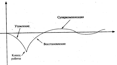 В первый период выполнения упражнения работа мышц обеспечивается в основном за счет анаэробных (гликолитических) механизмов с образованием молочной кислоты. Ее попадание в кровь активизирует через ЦНС и специальные рецепторы, находящиеся в сосудистой системе и непосредственно в вегетативных органах, деятельность последних. Следовательно, окисление образовавшейся в первый период работы молочной кислоты – так называемый кислородный долг – может происходить частично как в процессе самой дальнейшей работы, так и после ее окончания. Причем чем мощнее упражнение, тем больший образуется кислородный долг и тем большее время требуется после окончания работы для его возмещения. Важно, что правильно проведенная разминка укорачивает период врабатывания. «Мертвая точка» и «второе дыхание». Через некоторое время после начала напряженной и продолжительной работы часто наступает особое состояние, которое называют «мертвой точкой» и которое характеризуется тяжелыми субъективными ощущениями, среди них основные – одышка, стеснение в груди, пульсация сосудов в мозгу, желание прекратить работу. Объективно при этом повышается потребление кислорода, повышаются выведение СО2, частота сердечных сокращений, потоотделение. Основной причиной этого является чрезмерно интенсивное начало выполнения работы и накопление в связи с этим в организме молочной кислоты. Если в момент «мертвой точки» снизить интенсивность выполнения работы, довольно быстро она проходит и наступает внезапное облегчение, проявляющееся, прежде всего, в появлении нормального («комфортного») дыхания – так называемое «второе дыхание». В условиях же соревнований, когда снижать интенсивность работы нельзя, для достижения «второго дыхания» требуется приложить большие волевые усилия. «Второе дыхание» должно свидетельствовать о том, что организм достаточно мобилизован для удовлетворения рабочих своих запросов. Устойчивое состояние. При выполнении упражнений постоянной аэробной мощности вслед за врабатыванием наступает устойчивое состояние, характеризующееся стабилизацией физиологических функций организма на относительно постоянном уровне. При упражнениях малой мощности имеется качественное соответствие между потребностью организма в кислороде (кислородным запросом) и ее удовлетворением – истинное устойчивое состояние. При более высоких мощностях существует некоторое несоответствие между запросом и удовлетворением, однако, несмотря на постепенно накапливающийся кислородный долг, на протяжении некоторого времени физиологические функции продолжают оставаться неизменными – это так называемое условное, или ложное, устойчивое состояние. Образующийся при этом кислородный долг тем больше, чем мощнее и длительнее работа. В упражнениях же анаэробной мощности устойчивое состояние выделить вообще нельзя, так как на протяжении всего времени их выполнения быстро повышается кислородный долг и происходят прогрессивные изменения других физиологических функций. Утомление – это совокупность изменений, происходящих в организме при выполнении упражнений и приводящих к снижению работоспособности. Субъективно утомление выражается усталостью, однако между ним и утомлением нет четкой зависимости: если последнее обусловлено объективными изменениями в орг