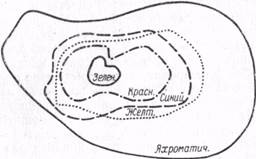даже в отношении движения самого простого объекта. Наибольшая величина характеризует направление кнаружи, затем книзу, а направление кверху и кнутри характеризуется наименьшей для этих условий величиной (разница — 30°). Поле зрения для цветных объектов сужается сравнительно с условиями восприятия белого цвета. Оно меньше для синего цвета, еще меньше для красного света и наименьшее для зеленого цвета (см. рис. 6). Еще более сужается поле зрения для предметного эрения, т. е. момента появления в боковых частях поля зрения какого-либо уменьшенного изображения предмета. Опыты с периметром подтверждают большую чувствительность боковых частей сетчатки к светотеням и меньшую их чувствительность к цветам.