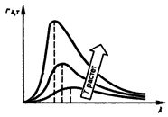 Рис. 9.4. Зависимость спектральной плотности энергетической светимости абсолютно черного тела от температуры.