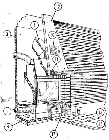 Размещенные в таблице 9.1 размеры взяты из книги В.М. Колеватова [6] и рекомендованы К. Престорфом (ГДР). Однако сечения дымохода там великоваты и не всегда удобны для выкладывания из кирпича из-за некратности размеров. Поэтому в последней графе приведены испытанные на практике и более подходящие размеры. Боковые стены топки у настоящего камина должны располагаться под углом 22-23 градуса к перпендикуляру от фронтальной плоскости, а задняя стена, начиная примерно с высоты 30 см. под таким же углом к вертикали. Камин закрытого типа Огонь в топке отделен от помещения одним или несколькими кварцевыми стеклами. Топки данного типа преимущественно импортные (например, Rösler-kamin из Германии [7]). Возможно проектирование и изготовление топки в местных условиях и оснащение её кварцевым стеклом. Смысл в данной работе может быть при необходимости подсоединить камин к уже существующему в стене каналу недостаточного сечения. Угольки в комнату на полтора метра не стреляют при использовании смолистых дров из хвойных пород. Кпд при этом близок к печному. Подача воздуха в топку может осуществляться из соседнего помещения или из подвала. Для повышения кпд устраивают конвективный обогрев помещения, за счет движения воздуха вокруг металлического кожуха камина. Недостаток топки – потеря ментального контакта с открытым огнем, ухудшение эстетического вида камина из-за зарастания стекла сажей при сжигании дров в течении 0,5-1 часа. На рис. 9.10 дана геометрическая схема закрытого камина.