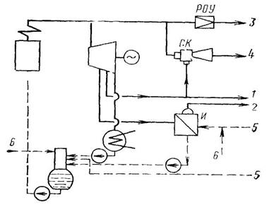 Рис. 11.2. Простейшая схема различных способов отпуска пара с ТЭЦ 1 – пар из отбора турбины; 2 – вторичный пар из испарительных установок; 3 – пар после редукционно-охладительных установок; 4 – пар после струйного компрессора; 5 – конденсат от потребителей; 6 – подпиточная вода Пароводяные теплофикационные подогреватели и сетевые насосы устанавливаются в подвальном помещении под турбиной. У современных крупных теплофикационных турбин подогреватели встроены непосредственно в турбинную установку. Пиковые водогрейные котлы устанавливаются обычно на ТЭЦ в полуоткрытых помещениях, примыкающих к котельному залу главного корпуса. Здание выполняется лишь для нижней части котлов, а верхняя часть остается на открытом воздухе. Тип и число пиковых котлов выбирается с учетом резервирования тепловой нагрузки для всей ТЭЦ. Теплофикационные пароводяные подогреватели сетевой воды представляют собой трубчатые теплообменники, в которых вода идет по трубам, а пар – в межтрубном пространстве. В большинстве случаев трубки делают прямыми для возможности механической их очистки. Корпусы, водяные камеры и трубные доски подогревателей выполняются, как правило, стальными, трубки – латунными – при докритических начальных параметрах пара перед турбиной и из нержавеющей стали – при закритических параметрах для предупреждения осаждения меди на лопатках турбины. В качестве пиковых водогрейных котлов на ТЭЦ используются серийно выпускаемые стальные водогрейные котлы типа KBГМ и ПТВМ на давления до 2,2 МПа, работающие, как правило, на газе и мазуте.