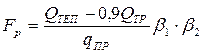 де, FP – необхідна площа поверхні опалювальних приладів, м2; QТЕП – тепловтрати приміщення, Вт; QТР – сумарна тепловіддача відкрито прокладених труб; 0,9 – коефіцієнт, який враховує частку теплового потоку від трубопроводів, необхідних для підтримки температури повітря в приміщенні; qпр – розрахункова густина теплового потоку, Вт/м2; b1 – коефіцієнт, який враховує додатковий тепловий потік від опалювальних приладів за рахунок заокруглення кількості секцій; b2 – коефіцієнт, який враховує додаткові втрати тепла опалювальними приладами біля зовнішніх огороджень;
