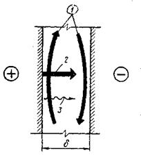 Рис. 4.2 – Схема теплопередачи в замкнутой воздушной прослойке: 1 – конвекцией; 2 – излучением; 3 – теплопроводностью В тонких прослойках или при небольшой разности температур на поверхностях (