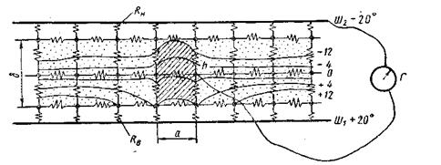 Существуют различные способы моделирования. Наиболее современным является численное моделирование с использованием персональной ЭВМ. Однако долгое время для оценки новых конструктивных решений и узлов использовался метод электроналогии. Суть его заключается в том, что процессы переноса тепла и процессы электропроводности дифференциальными уравнениями одного и того же вида. Полная аналогия между тепловым потоком и потоком электричества, термическим и омическим сопротивлениями дает возможность быстро измерять приборами параметры электрического поля. Моделирование в таком случае ведется на электроинтеграторах. Схема для изучения температурного поля представлена на рис. 5.6. Собирается электрическая цепь из электрических сопротивлений кратных термическим (Rк)и сопротивлениям у поверхностей (Rв и Rн), к токопроводящим шинам (ш1, ш2) которой подается разность потенциалов