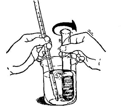 В этом опыте с помощью расплавленного парафина, вначале имеющего температуру, равную температуре его плавления, изменяют температуру взвешенного количества воды. Перед тем как приступить к выполнению лабораторной работы, нужно заготовить таблицу 4, как указано ниже. Последовательность действий: 1) получите у преподавателя пробирку длиной 150 мм и диаметром 18 мм, в которой находится около 10 г парафина. Взвесьте пробирку с парафином с точностью до 0,1 г. Запишите результат взвешивания. Массу пустой пробирки вам сообщит преподаватель; 2) взвесьте на весах пустой химический стакан на 250 см3, который будет использоваться в качестве калориметра. Запишите полученный результат взвешивания с точностью до 1 г; 3) наполните этот стакан примерно до половины холодной водопроводной водой. Если необходимо, воспользуйтесь льдом для охлаждения воды до температуры на 1–2 °С ниже комнатной. Взвесьте стакан с водой на тех же весах, где вы взвешивали пустой стакан. Запишите его вес; 4) наполните второй химический стакан на 250 см3 также примерно наполовину водой и нагрейте ее до кипения, а затем опустите в горячую воду пробирку с парафином и держите ее там до тех пор, пока парафин не расплавится, но не перегревайте его; 5) с помощью держателя для пробирки выньте пробирку с расплавленным парафином из горячей воды. Дайте парафину немного остыть, ровно настолько, чтобы в нем появились первые признаки помутнения (рисунок 3). Пока парафин остывает, измерьте и запишите температуру холодной воды в стакане, используемом в качестве калориметра, с точностью до 0,5 °С. Как только в парафине появятся признаки помутнения (затвердевания), быстро опустите пробирку с ним в стакан с холодной водой и плавно помешивайте пробиркой воду в стакане (рисунок 4). Запишите температуру воды в стакане в тот мо-