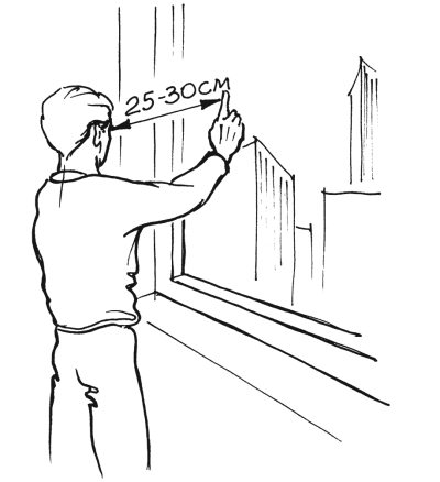 Глаза и мозг – одно целое. Восстанавливая глаза после утомительной работы, вы оказываете поддержку нервной системе и даете импульс мозгу для восстановления организма в целом. Предлагаю вашему вниманию специальный комплекс для глаз, который взбодрит вас лучше, чем чашка крепкого кофе! Те, кто носит очки или линзы, должны выполнять комплекс, предварительно сняв их. 1. Выполняется сидя. Крепко зажмурьте глаза на 3–5 секунд, а затем откройте их на 3– 5 секунд. Повторите 6–8 раз. Упражнение укрепляет мышцы век, способствует улучшению кровообращения и расслаблению мышц глаз. Восстанавливает тонус нервной системы. 2. Выполняется сидя. Быстро моргайте в течение 1–2 минут. Упражнение способствует улучшению кровообращения органа зрения. Активизирует нервную систему. 3. Выполняется стоя. Смотрите прямо перед собой вдаль в течение 2–3 секунд. Поставьте палец на расстоянии 25–30 см от глаз. Переведите взгляд на кончик пальца и смотрите на него в течение 3–5 секунд (рис. 55).