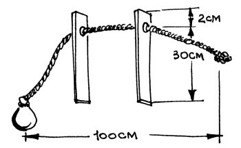 Рис. 64 Возьмите два палочки длиной по 30 см и, отступив от их верха по 2 см, просверлите в них по дырочке. Через эти дырочки проденьте веревку длиной 1 м. На одном конце веревки сделайте узелок, а к другому привяжите грузик. Теперь держите палочку со стороны узелка вертикально на расстоянии 7–8 см от своего носа, а другую палочку еще дальше, на расстоянии 20 см от первой. Грузик будет свободно висеть на дальнем конце веревки. Он будет держать веревку в натянутом состоянии. Медленно передвигайте дальнюю палочку взад – вперед то к носу, то от него, наблюдая за тем, как отверстие в двигающейся палочке вбирает в себя веревку в процессе приближения палочки к носу. Быстро моргайте во время этого процесса и не забывайте про дыхание. Начните вытягивать веревку в момент, когда палочки достаточно близко придвинуты друг к другу. Закройте глаза и вспоминайте то, что вы видели, продолжая двигать палочку взад – вперед. Затем с глубоким вдохом откройте глаза и снова продолжайте наблюдение (рис. 65).