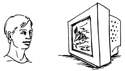 Больной садится левым боком к экрану и смотрит передачи правым глазом, смещая направление зрения в сторону переносицы. Левый глаз при этом закрыт повязкой либо заклеен кружком из лейкопластыря, на клейкую поверхность которого помещен кружок из марли на 1–2 см меньшего диаметра. Через некоторое время глаза меняются – смотрит левый, а больной поворачивается к экрану правым боком (рис. 68).