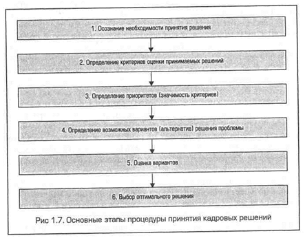 Тема лекции «Система управления человеческими ресурсами» Вопрос 1.4 ФУНКЦИИ СЛУЖБЫ УЧР: - стратегическое планирование; - проектирование рабочих процессов; - набор, отбор, адаптация кадров; - оценка персонала; - обучение и развитие кадров; - компенсации; - регулирование занятости. Основой деятельности кадровой службы является принятие стратегических и оперативных решений. Для российских предприятий это составляет особую проблему. Положительный опыт в данной области длительное время отсутствовал. Многие аспекты кадровой работы определялись государством централизованно и доводились до предприятий сверху. Свобода принятия решений была ограничена. Зачастую отсутствовала также заинтересованность руководителей предприятий в выборе оптимальных решений. В условиях рыночной экономики эффективное хозяйствование становится необходимым условием экономического успеха предприятия. Это обусловливает изменение отношения к принятию кадровых решений, заставляет тщательно анализировать все имеющиеся в этой области возможности, проводить оценку эффективности различных вариантов и на этой основе выбирать наиболее удачные с экономической и социальной точки зрения решения. На рис. 1.7 показаны шесть основных этапов, которые, как правило, необходимо пройти, принимая кадровые решения. Этап 1. Процесс принятия любого управленческого решения начинается с обоснования необходимости принятия такого решения и постановки конкретных задач. К их числу можно отнести, например, следующие задачи: -организовать обучение сотрудников методам работы на новом оборудовании; -сократить к началу следующего года численность персонала компании на 30%; -принять на работу в отдел продаж трех торговых представителей в связи с планируемым увеличением объема продаж; -и другие задачи.